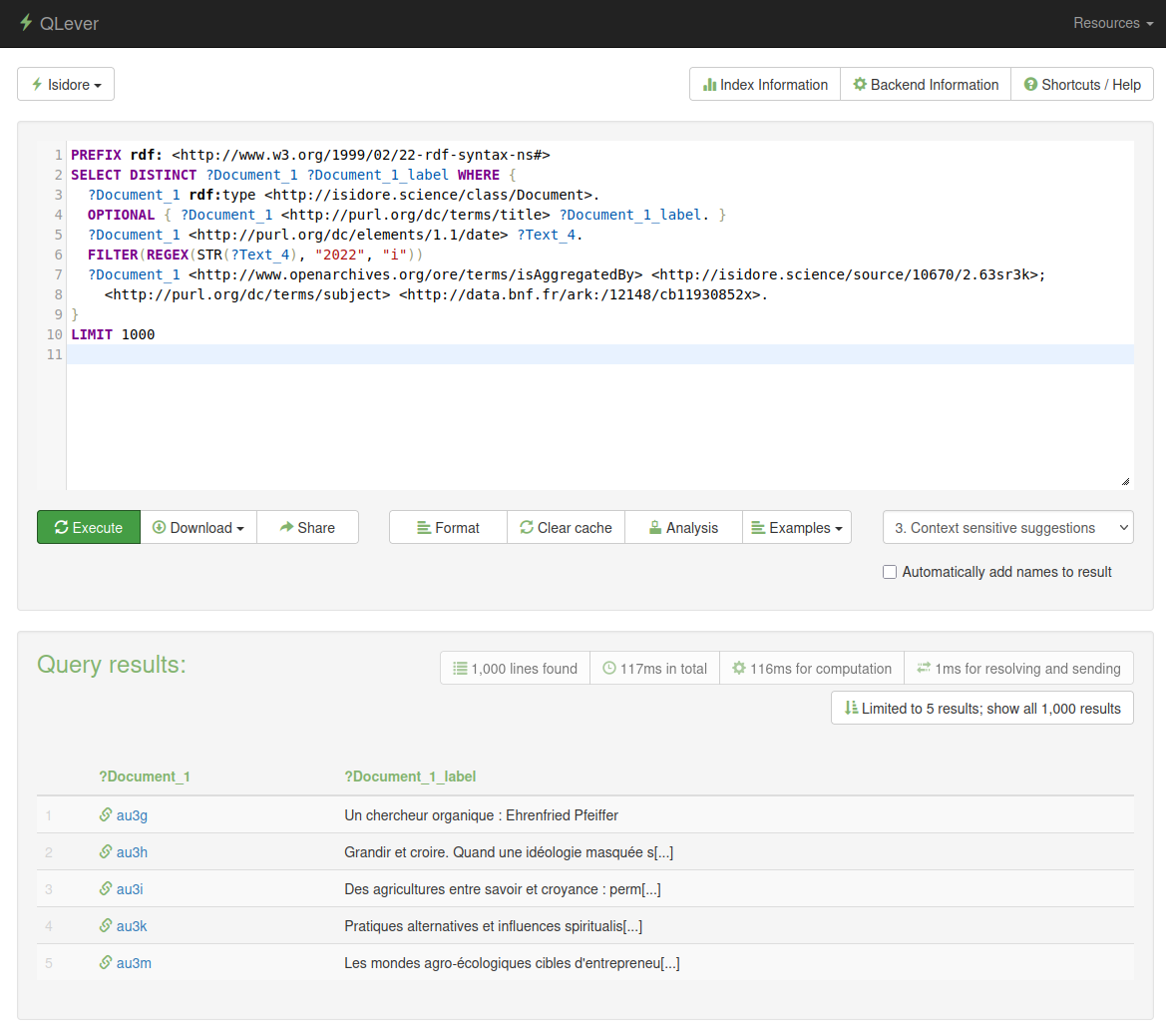 We decided to test QLever to load the full dataset of all documents, sources, collections and authors of Isidore. The dataset is 420 million triples, broken down into 18 million files (!) and the server at our disposal was a medium-size 4 CPU, 32Gb RAM machine. We asked the expertise of our partner of QLeverize, who did an excellent job at deploying Qlever and ingesting the dataset.