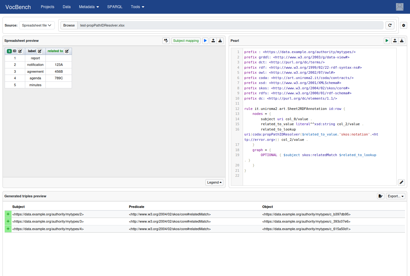 Sheet2RDF is integrated in VocBench and can be used either to populate VocBench projects, but also simply to download the result of the mapping in an RDF file.